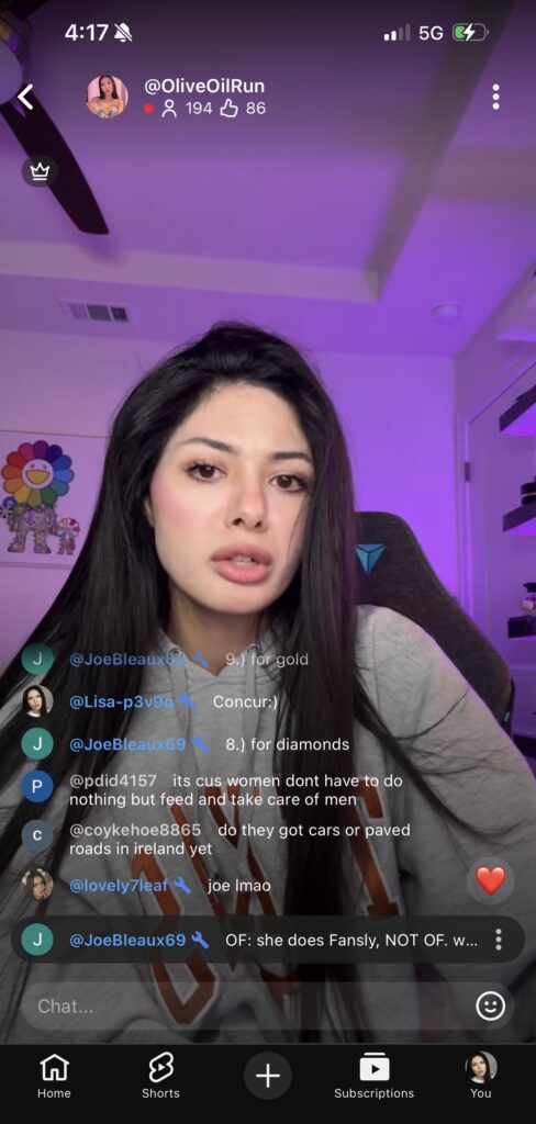 I’m back to moderating online again. I haven’t done this since the days of Alki David, the eccentric billionaire, on the Battlecam website—especially on Bishhh’s channel. Now, I’m moderating OliveOilRun’s YouTube live stream. Who’s OliveOilRun? She’s someone who appeared on Dr. Phil and is a big social media influencer.